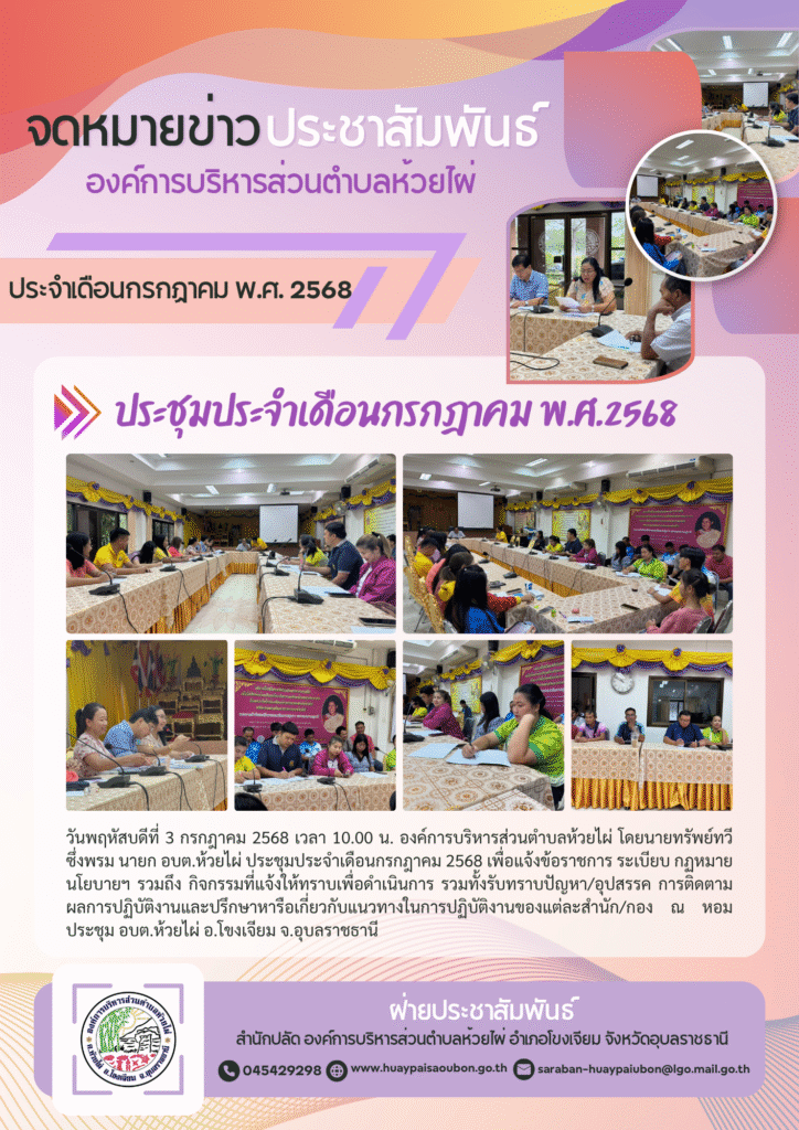 ในวันศุกร์ที่ 22 สิงหาคม 2568 เวลา 09.00 น. นายทรัพย์ทวี ซึ่งพรม นายก อบต.ห้วยไผ่ เป็นประธานในการประชุมคณะผู้บริหาร ข้าราชการ พนักงานส่วนตำบล พนักงานจ้าง อบต.ห้วยไผ่ ณ หอประชุม อบต.ห้วยไผ่ อ.โขงเจียม จ.อุบลราชธานี