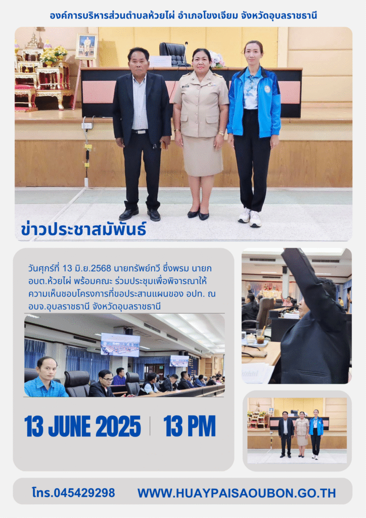 วันศุกร์ที่ 13 มิ.ย.2568 นายทรัพย์ทวี ซึ่งพรม นายก อบต.ห้วยไผ่ พร้อมคณะ ร่วมประชุมเพื่อพิจารณาให้ความเห็นชอบโครงการที่ขอประสานแผนของ อปท. ณ อบจ.อุบลราชธานี จังหวัดอุบลราชธานี